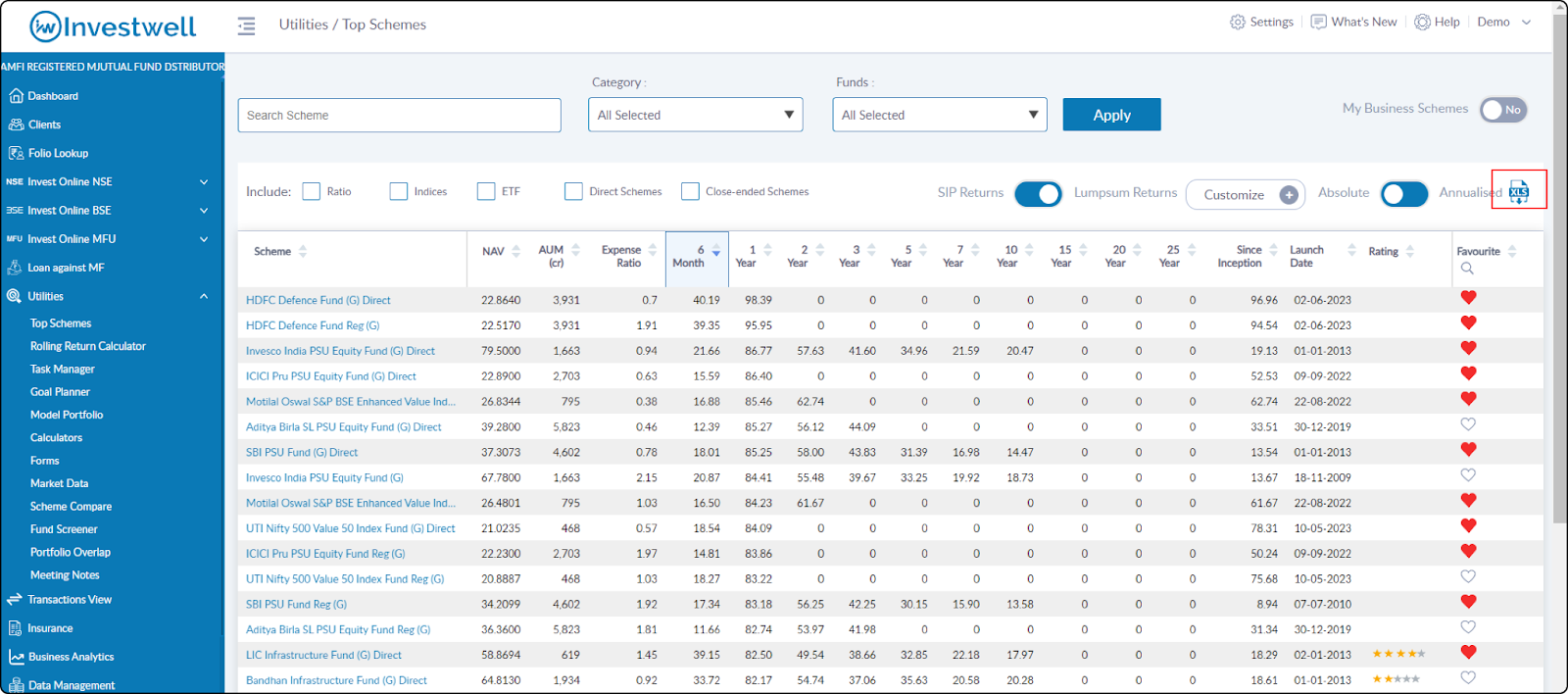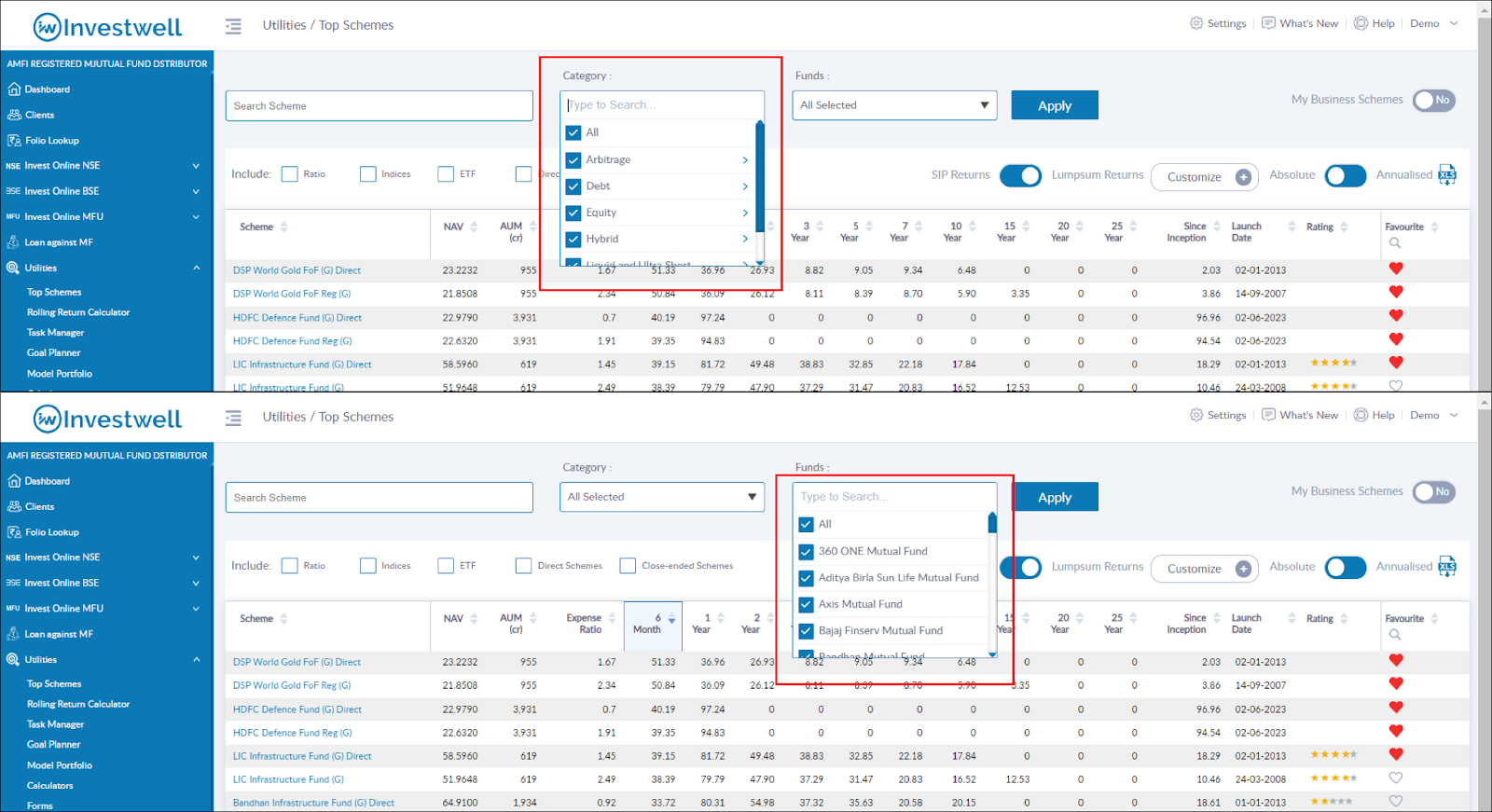 Multi-Select Options in Category and Funds in Top Schemes:-