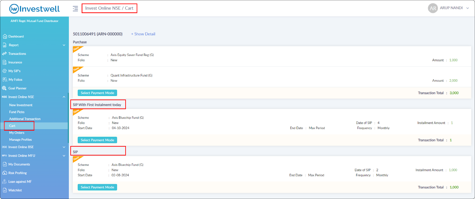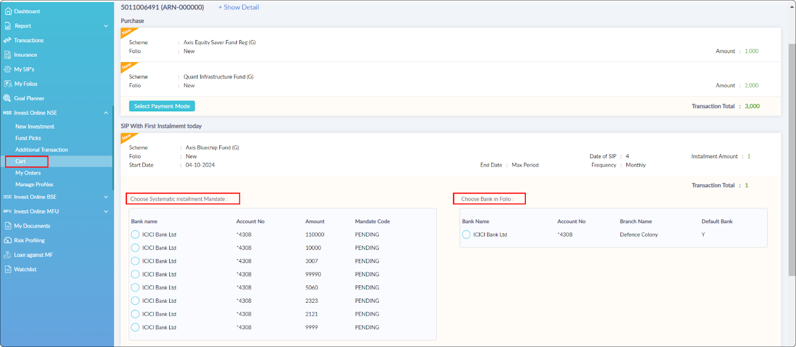 Invest Online NSE > Cart > Go To Cart > Select Payment Mode