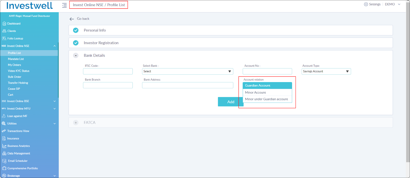 With the latest update, a new section has been introduced for selecting the bank account relation while creating the IIN of a Minor.