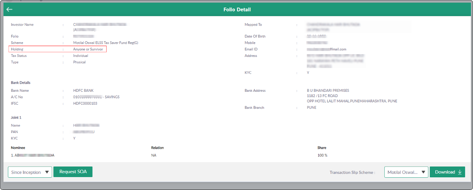 A user reported a bug where the Holding Nature field was showing as blank when checking the folio details.