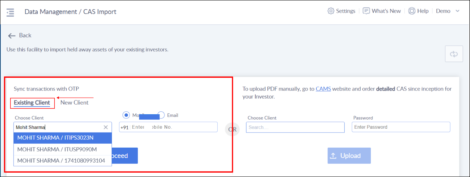 Note: If an existing client’s PAN is entered as a new client, their funds will still be imported normally and mapped to the existing client.