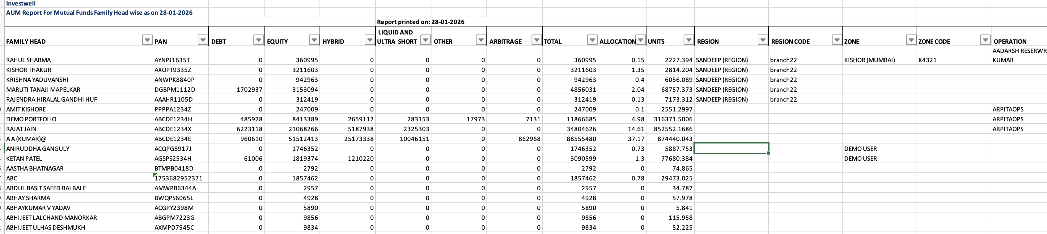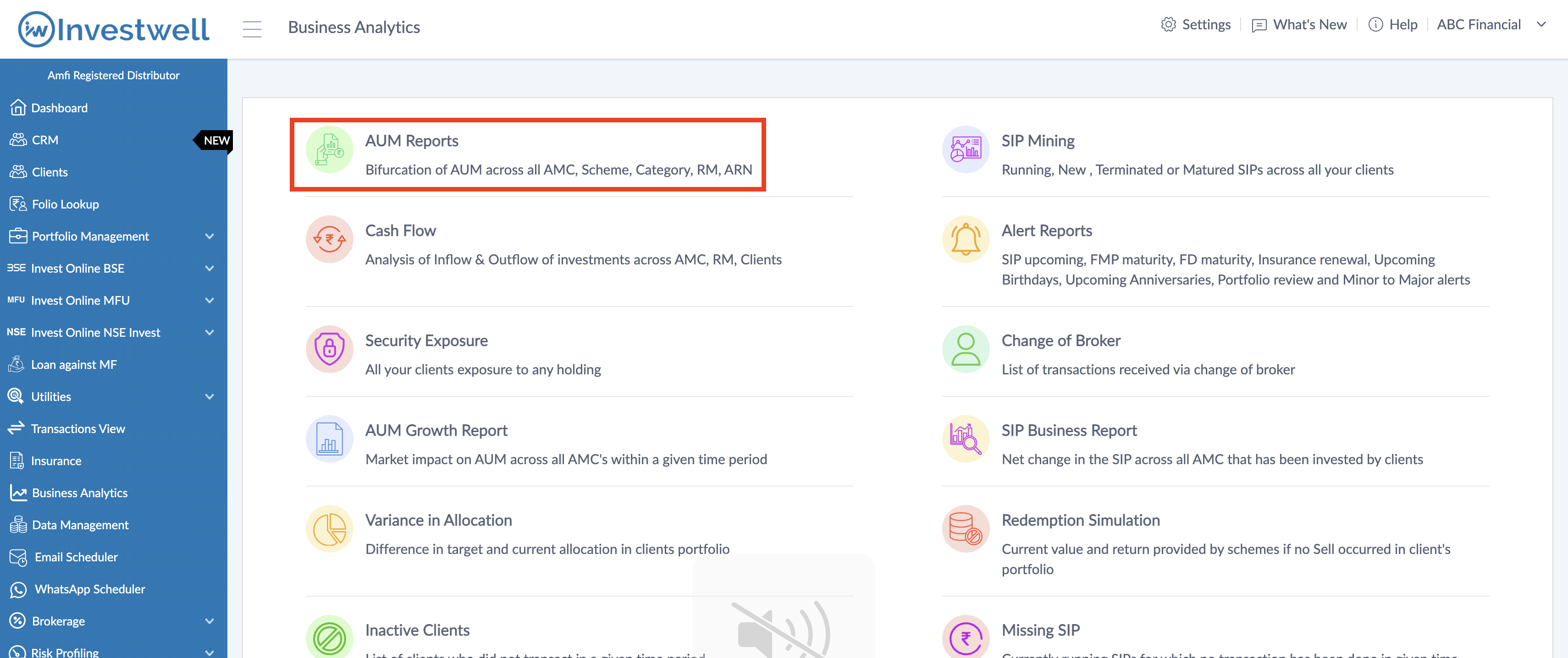 This is the first report available under Business Analytics menu. It can also be accessed from your Broker dashboard by clicking on the AUM tab. By default it shows you all the AUM under your ARNs or RIA code.