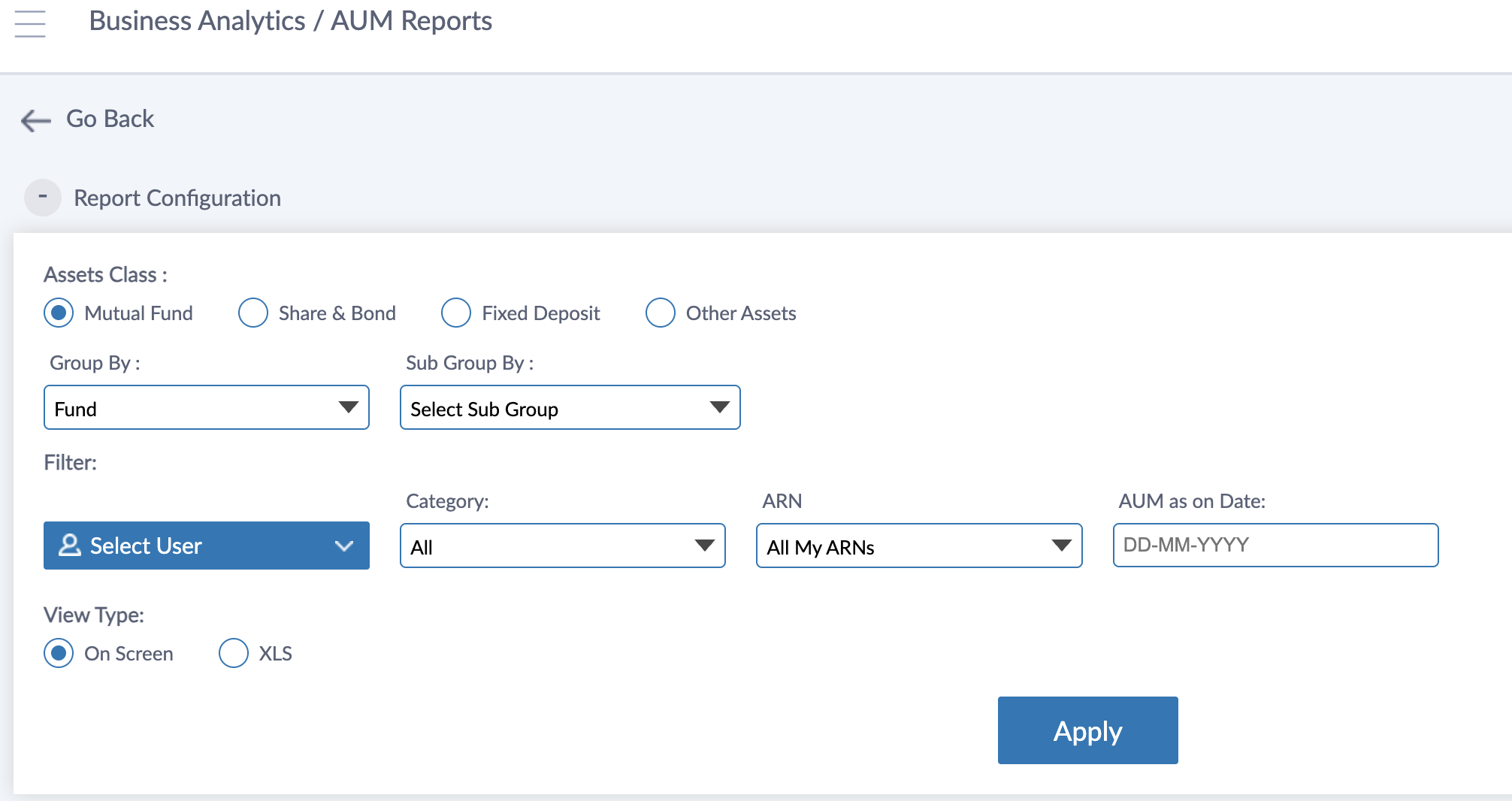 The AUM as on Date filter can be used to take the AUM report on any back date. The ARN filter can be used to either select All My ARNs (which will include all the managed AUM under your ARNs) or a single ARN.