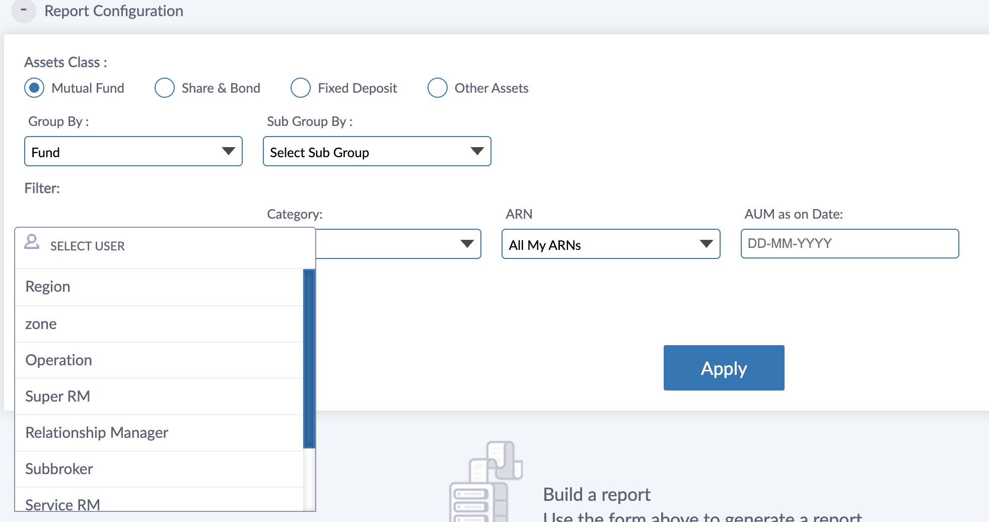 Select User filter can be used to choose a particular individual of any level (RM, Sub broker, branch etc) and see the AUM under that individual