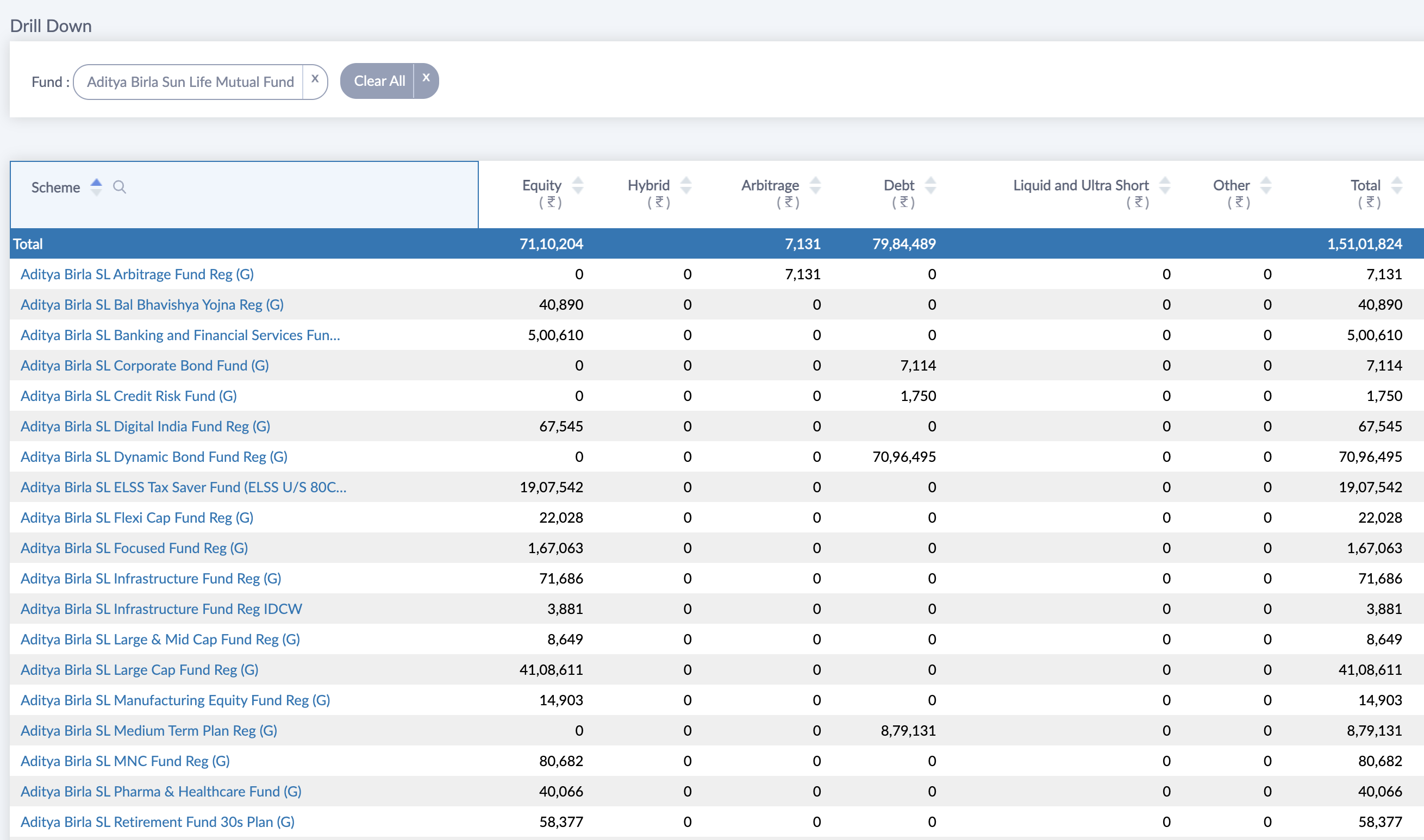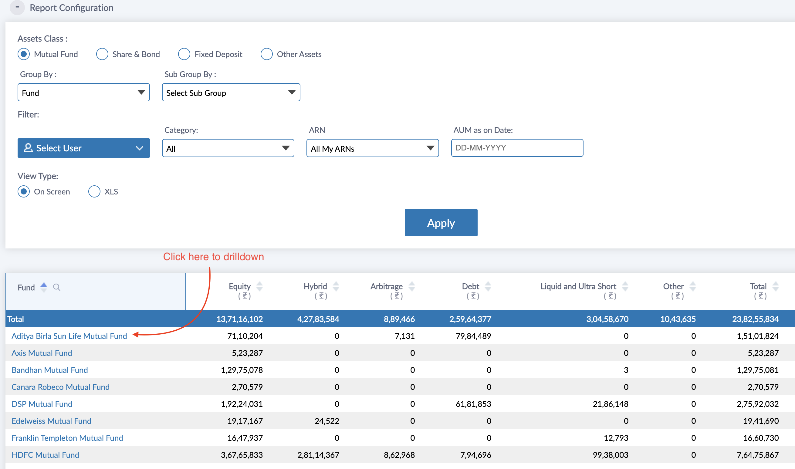 If you view the AUM report with a single grouping then you can drilldown any select value to view details under that drilldown. For example, if you view Fund wise AUM report and click on a Fund name then you can see the various schemes under that Fund in which AUM is bifurcated.
