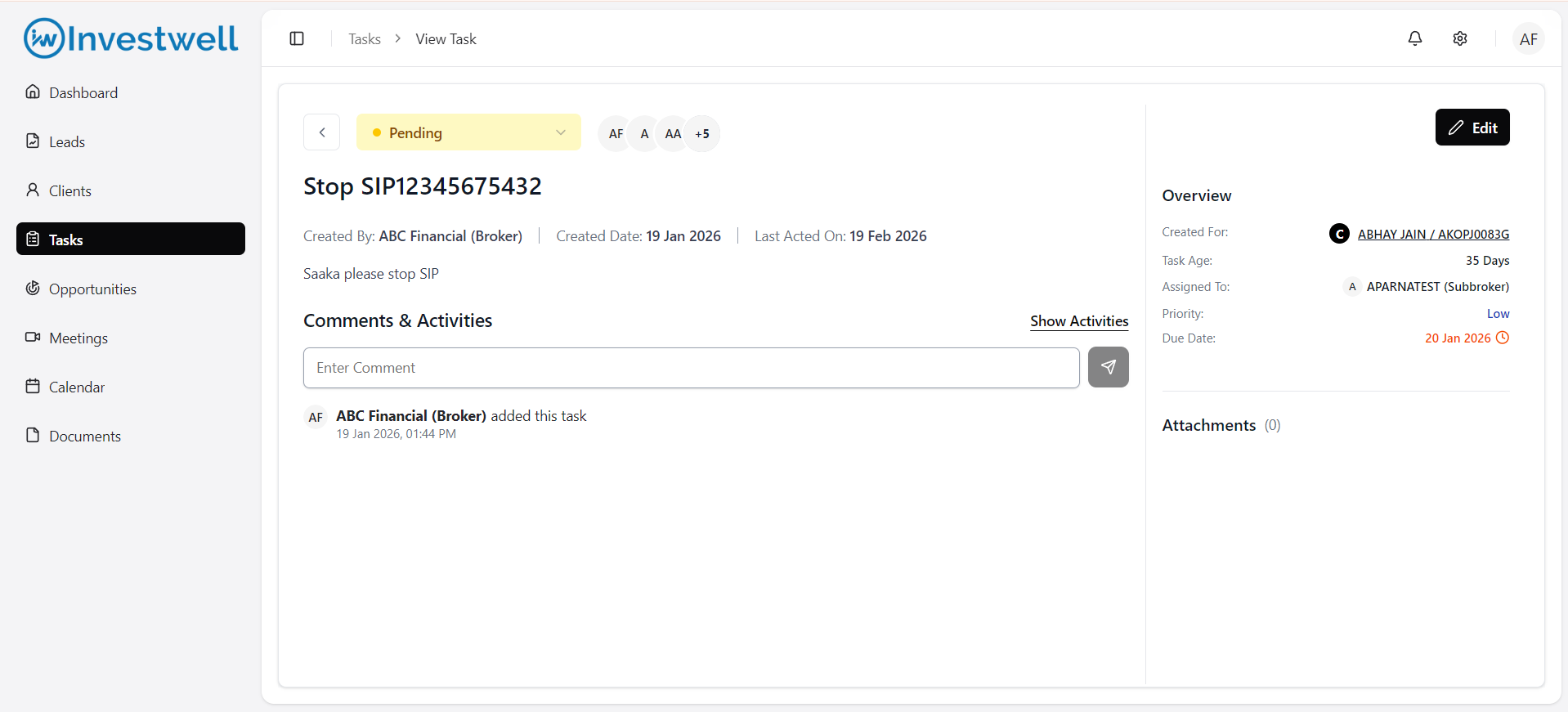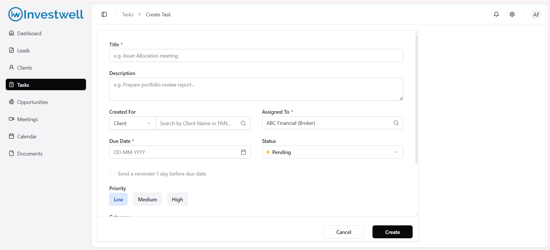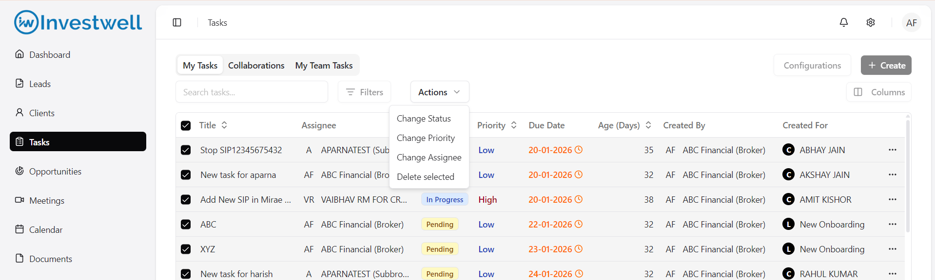 The Tasks Module in Investwell CRM helps you manage all follow-ups, client interactions, and internal action items in one place. Each task can be assigned to a team member, linked to a client or lead, and tracked until completion.